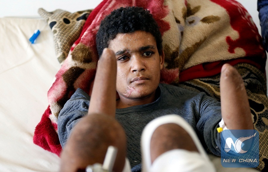 A young man who claims he was injured by an airstrike shows his amputated arms as he lies on a bed at a hospital where he is treated in Sanaa, Yemen November 14, 2017. (Reuters Photo)