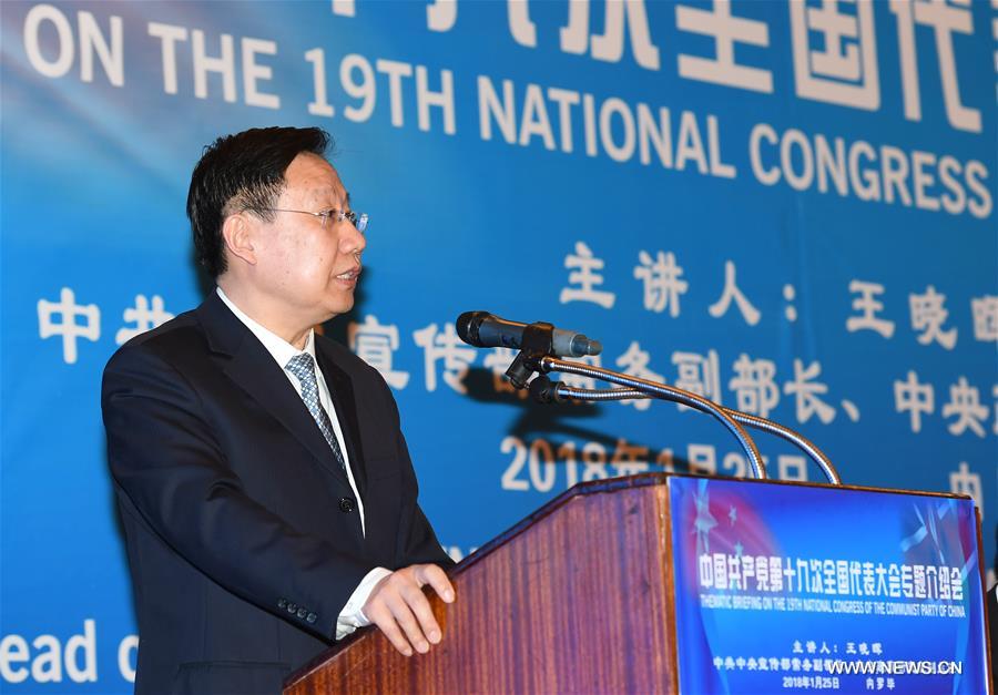 Wang Xiaohui, deputy head of the Publicity Department of the Communist Party of China (CPC) Central Committee and executive vice director of the Policy Research Office of the CPC Central Committee, introduces the essence and achievements of the 19th National Congress of the CPC during his visit in Nairobi, capital of Kenya, on Jan. 25, 2018. (Xinhua/Chen Cheng)