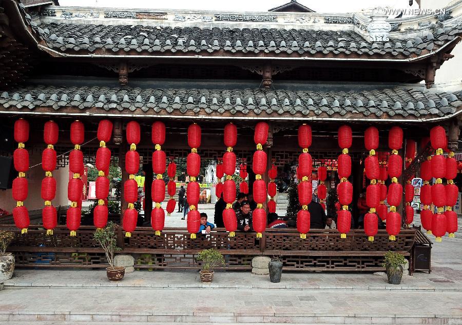 Tourists visit Xiasi Ancient Town in Miao-Dong Autonomous Prefecture of Qiandongnan, southwest China's Guizhou Province, Feb. 13, 2018. The ancient town was decorated by red lanterns to celebrate the coming Spring Festival which falls on Feb. 16. (Xinhua/Cai Xingwen)