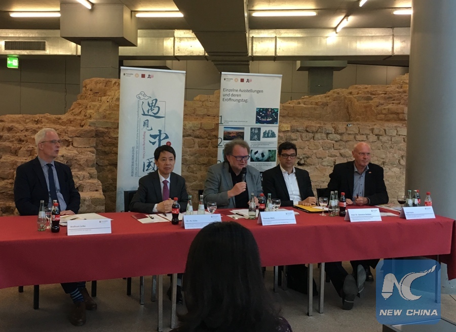 Hu Sishe (L2), vice-chair of Chinese People's Association for Friendship with Foreign Countries, Trier Mayor Wolfram Leibe (L1), Chairman of Association of German-Chinese Societies Kurt Karst (R1) attend a press conference on April 20, 2018 in Trier, a city in western Germany, which will host a 3-month long exhibition series themed "Meet with China" starting from June 1. (Xinhua/Shen Zhonghao)