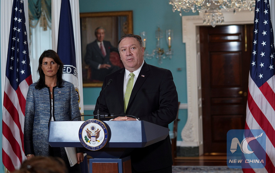 U.S. Secretary of State Mike Pompeo delivers remarks to the press together with U.S. Ambassador to the United Nations Nikki Haley, announcing the U.S.'s withdrawal from the U.N's Human Rights Council at the Department of State in Washington, U.S., June 19, 2018. (REUTERS PHOTO)