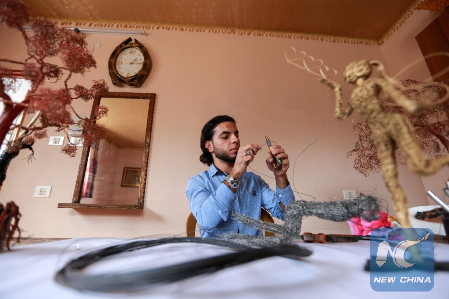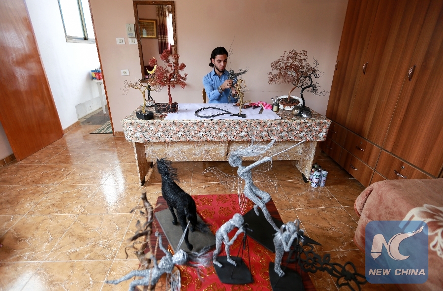GAZA, Nov. 8 (Xinhua) -- Using metal wires, 20-year-old Palestinian Mahmoud al-Nabahin from the Gaza Strip, carves unconventional works called "wire sculpture."