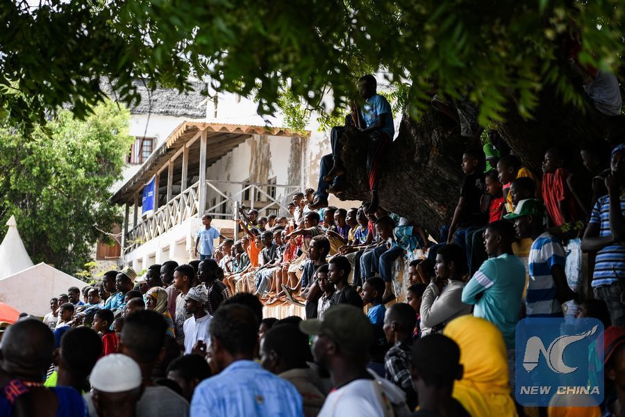 Tourists watch the donkey race during the Lamu Cultural Festival in Lamu, Kenya, Nov 24, 2018. (Xinhua/Li yan)
