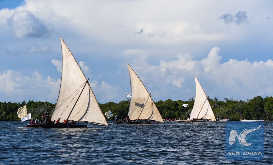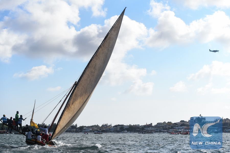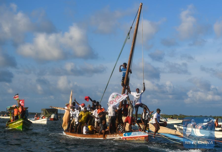 Local people compete in the dhow competition during the Lamu Cultural Festival in Lamu, Kenya, Nov 24, 2018. (Xinhua/Li yan)