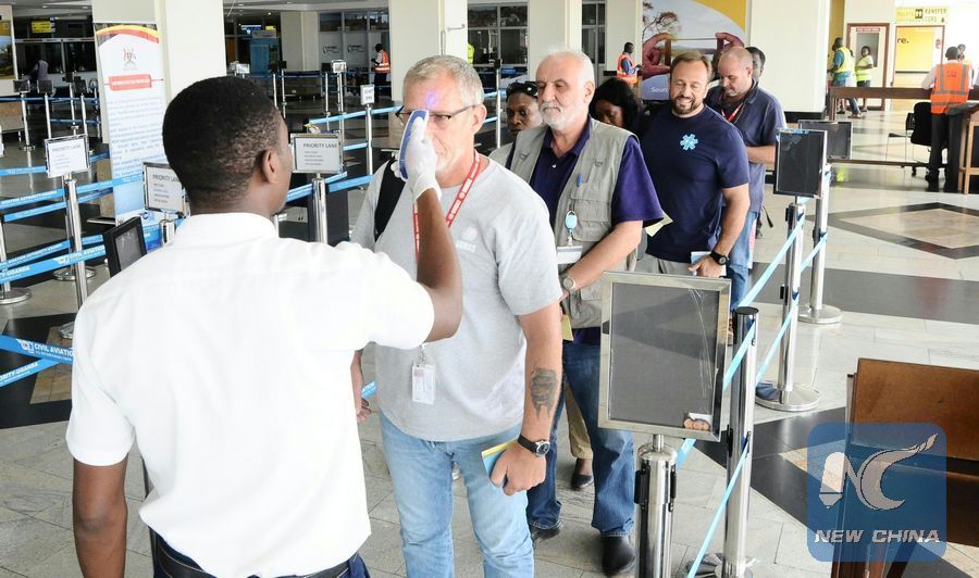 File photo shows passengers queue to be screened at Uganda's Entebbe International Airport on May 15, 2018. (Xinhua/Joseph Kiggundu)