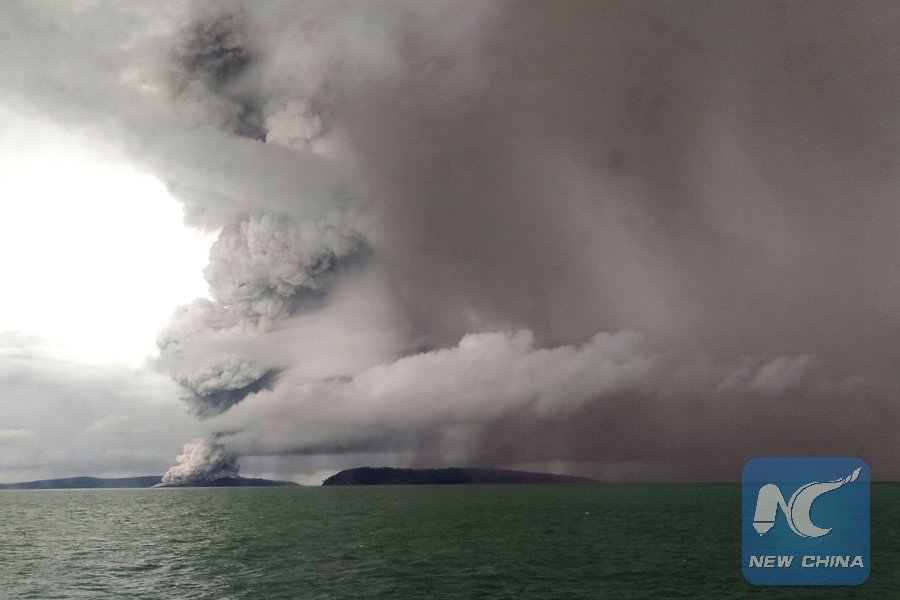 Picture taken on Dec. 26, 2018 shows the Anak Krakatoa volcano erupting, as seen from a ship on the Sunda Straits. Indonesia on Dec. 27 raised the danger alert level for a volcano that sparked a killer tsunami, after previously warning that fresh activity at the crater threatened to launch another deadly wave. (Xinhua/AFP)