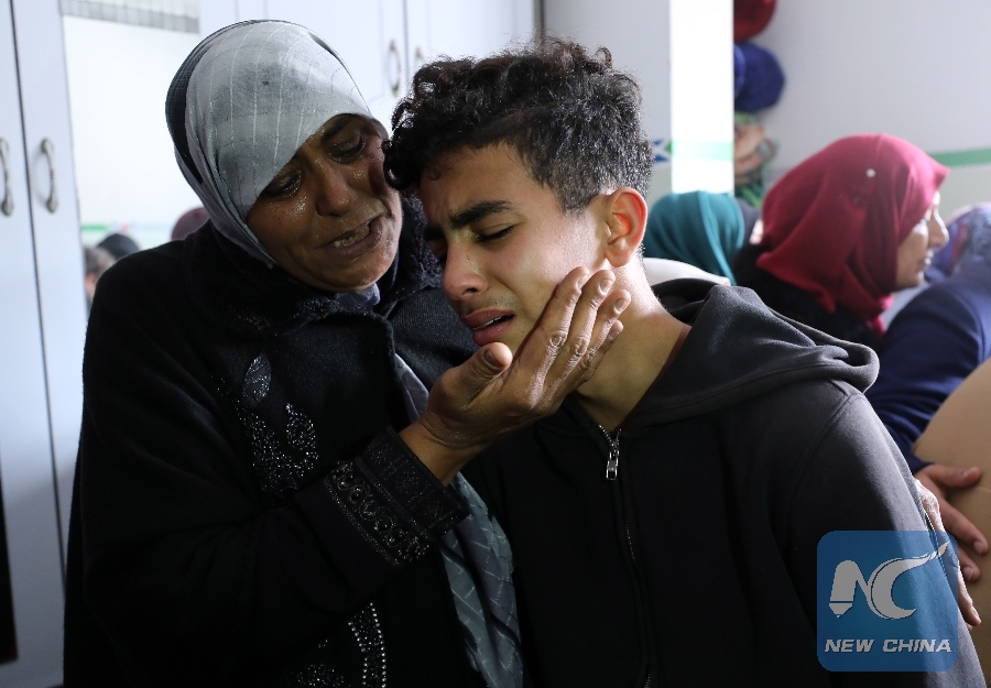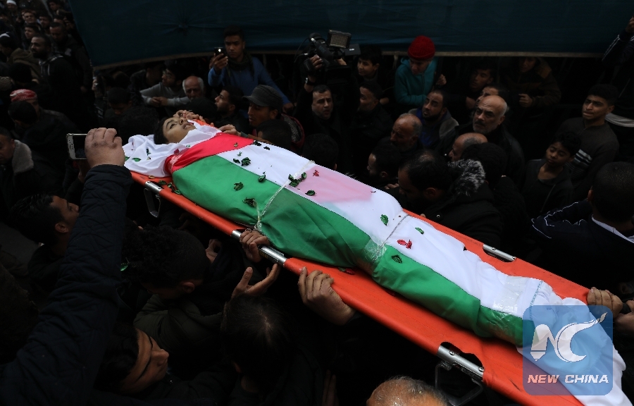 GAZA, Feb. 9 (Xinhua) -- Hundreds of grieved and outraged Palestinian mourners buried on Saturday two teenagers, who were shot and killed on Friday by Israeli soldiers' gunfire near the border between the eastern Gaza Strip and Israel.