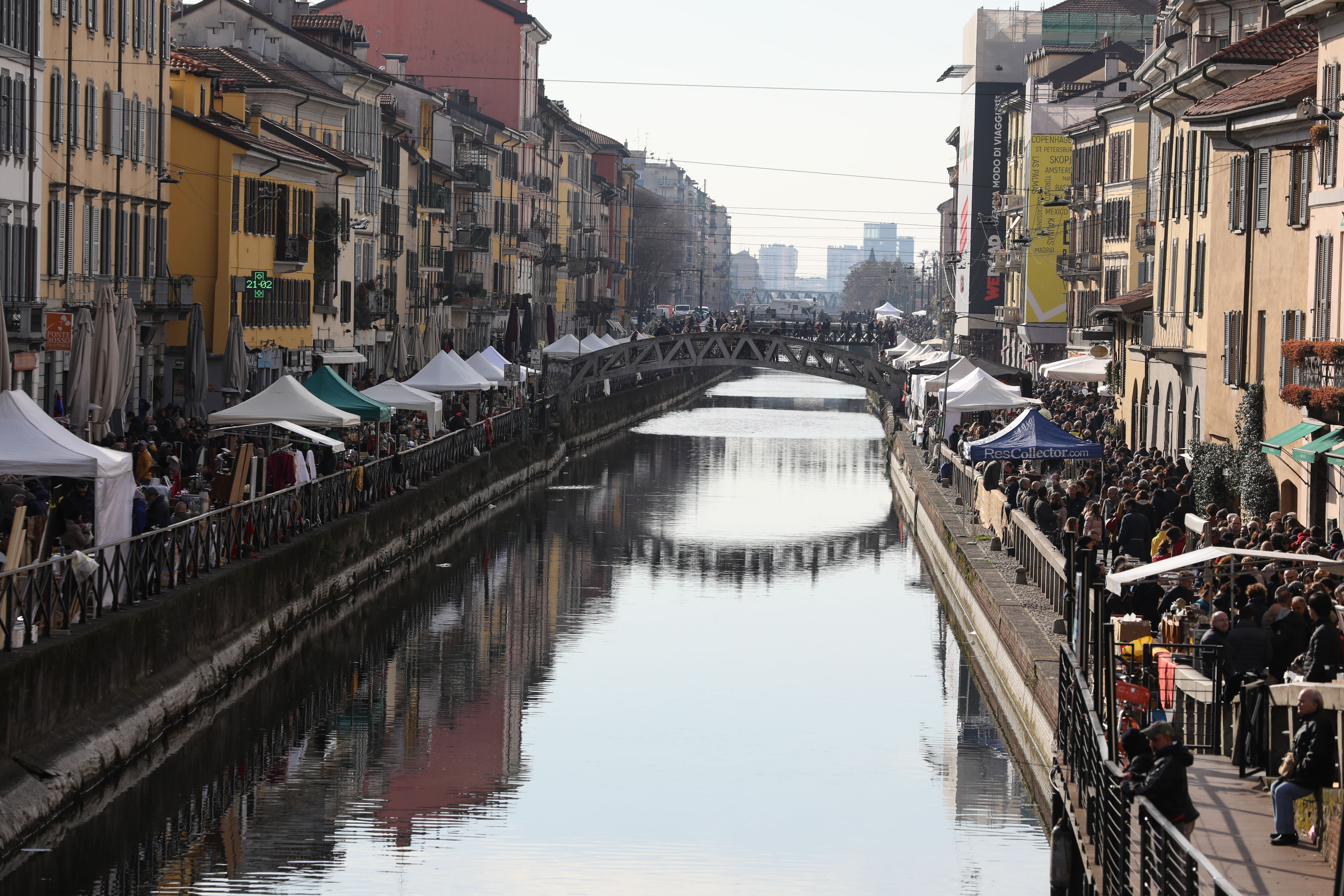 People visit the antique market along the Naviglio Grande in Milan, Italy, Feb. 24, 2019. (Xinhua/Cheng Tingting)