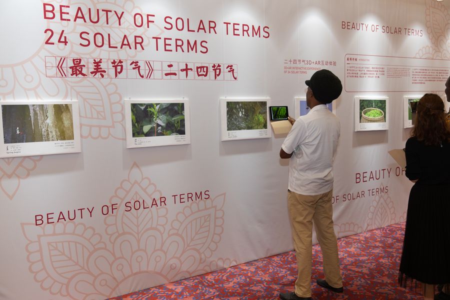 A local artist views a 3D+AR interactive display of 24 solar terms during the "Meet China Digital Media Arts Exhibition" in Lusaka, Zambia, on Nov. 14, 2019. (Xinhua/Peng Lijun)