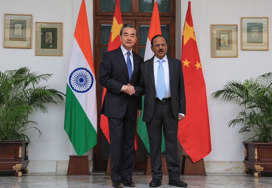 Visiting Chinese special representative, State Councilor and Foreign Minister Wang Yi (L) shakes hands with Indian special representative and National Security Advisor Ajit Doval at the 22nd meeting between Chinese and Indian special representatives on boundary issues in New Delhi, India, Dec. 21, 2019. (Xinhua/Javed Dar)