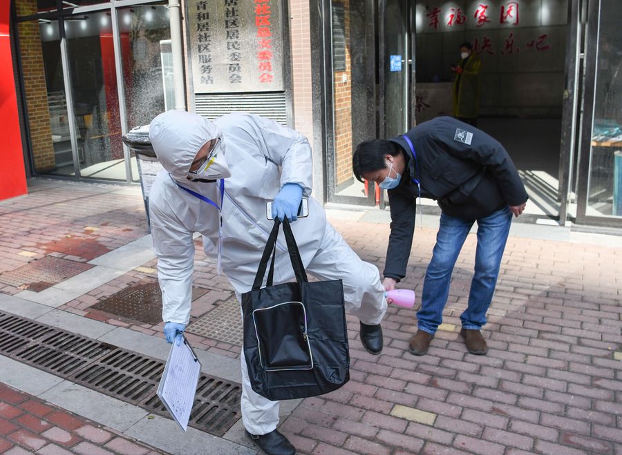 A staff member gets disinfected before taking part in a health screening campaign at Qingheju Community in Qingshan District of Wuhan, capital city of central China's Hubei Province, Feb. 18, 2020. (Xinhua/Cheng Min)
