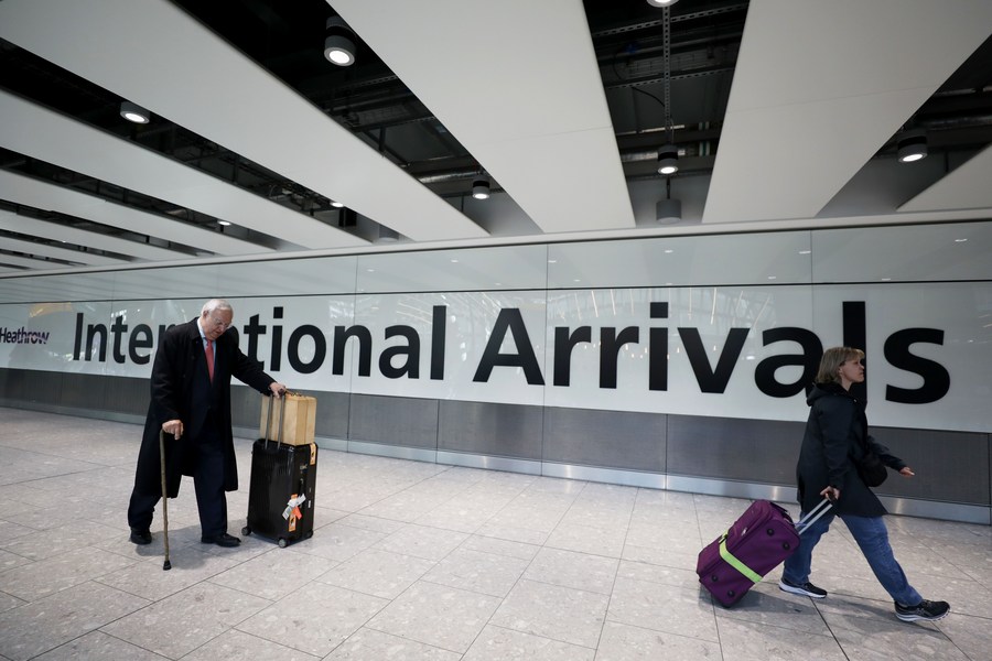Passengers walk at the international arrivals area in Heathrow Airport in London, Britain, March 18, 2022. (Xinhua/Li Ying)