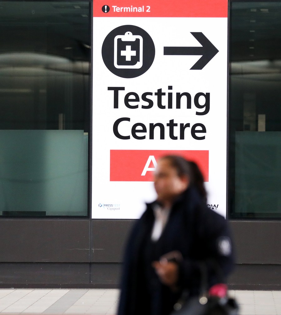 A woman walks past a sign indicating the testing centre in Heathrow Airport in London, Britain, March 18, 2022. (Xinhua/Li Ying)■