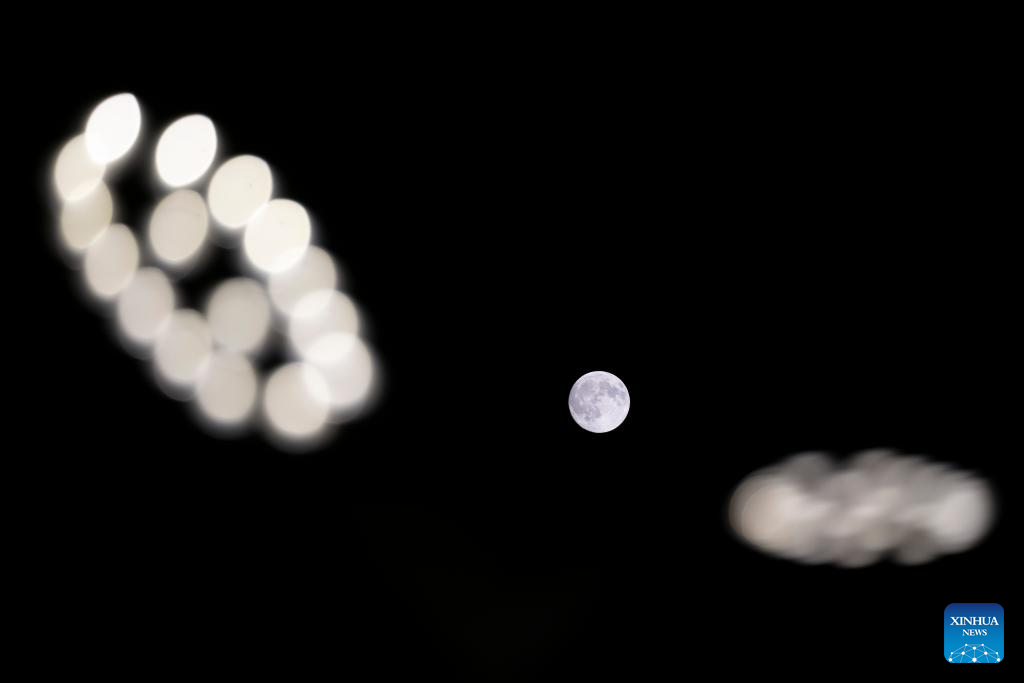 A full moon is pictured in Urumqi, northwest China's Xinjiang Uygur Autonomous Region, Oct. 6, 2025. Monday marks this year's Mid-Autumn Festival, which is celebrated annually on the 15th day of the eighth month in the Chinese lunar calendar. People across China admire the full moon to celebrate the traditional holiday. (Xinhua/Xu Hongyan)