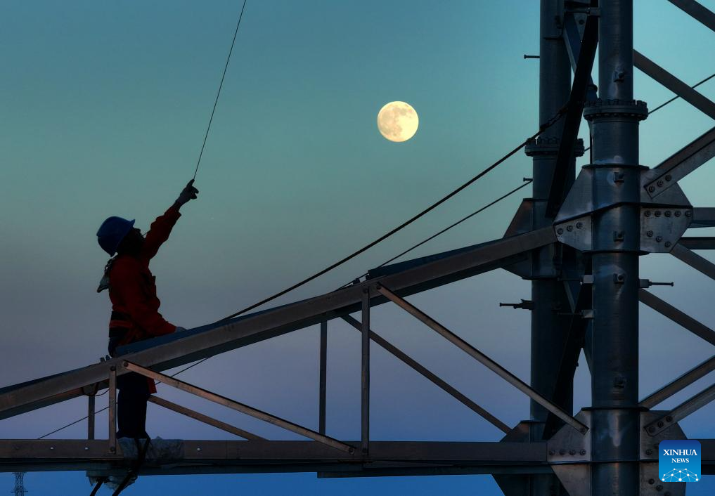 A drone photo taken on Oct. 6, 2025 shows a worker against the backdrop of a full moon in Hengyang, central China's Hunan Province. Monday marks this year's Mid-Autumn Festival, which is celebrated annually on the 15th day of the eighth month in the Chinese lunar calendar. People across China admire the full moon to celebrate the traditional holiday. (Photo by Cao Zhengping/Xinhua)