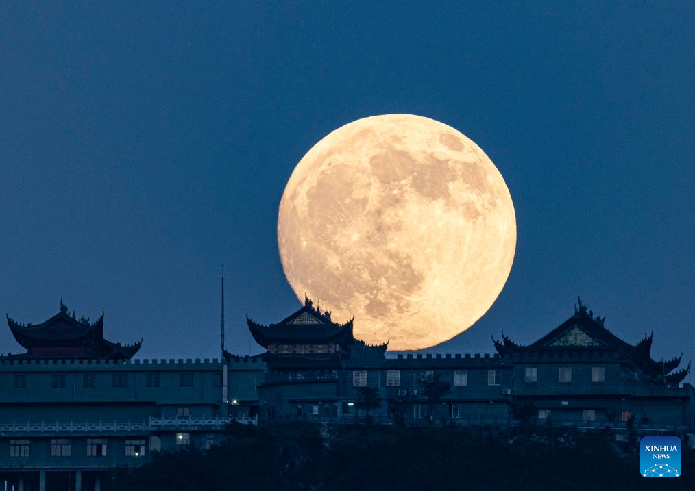 A full moon is pictured in Cangnan County of Wenzhou, east China's Zhejiang Province, Oct. 6, 2025. Monday marks this year's Mid-Autumn Festival, which is celebrated annually on the 15th day of the eighth month in the Chinese lunar calendar. People across China admire the full moon to celebrate the traditional holiday. (Photo by Su Qiaojiang/Xinhua)