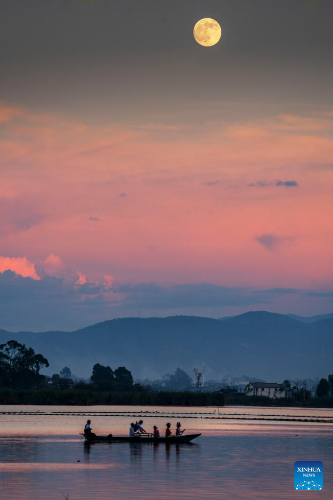 This aerial drone photo taken on Oct. 6, 2025 shows people viewing the moon on a boat in Eryuan West Lake in Dali Bai Autonomous Prefecture, southwest China's Yunnan Province. Monday marks this year's Mid-Autumn Festival, which is celebrated annually on the 15th day of the eighth month in the Chinese lunar calendar. People across China admire the full moon to celebrate the traditional holiday. (Photo by Luo Xincai/Xinhua)