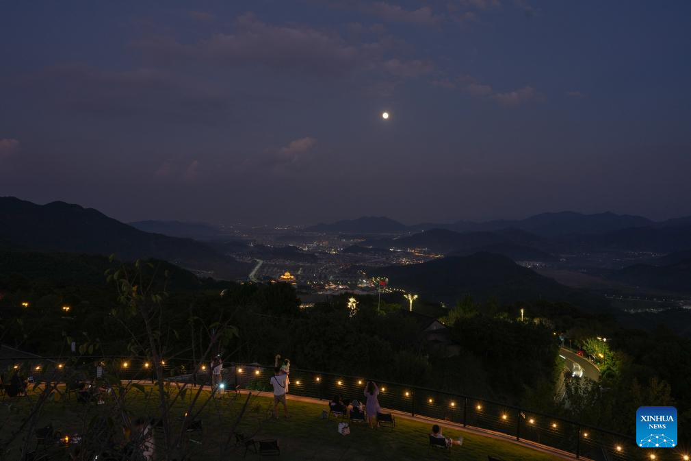 Tourists take photos for the full moon in Ningbo, east China's Zhejiang Province, Oct. 6, 2025. Monday marks this year's Mid-Autumn Festival, which is celebrated annually on the 15th day of the eighth month in the Chinese lunar calendar. People across China admire the full moon to celebrate the traditional holiday. (Xinhua/Huang Zongzhi)
