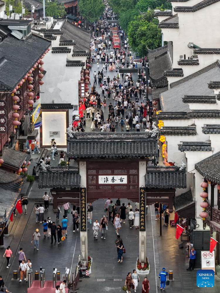 A drone photo taken on Oct. 7, 2025 shows tourists visiting the Fuzi (Confucius) Temple scenic area in Nanjing, east China's Jiangsu Province. Tourists across the country show no sign of fading enthusiasm as the National Day and Mid-Autumn Festival holiday draws to a close. (Xinhua/Li Bo)