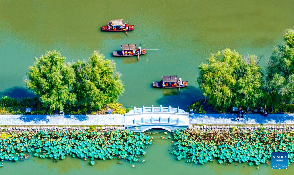 A drone photo taken on Oct. 7, 2025 shows tourists taking boats at the Lixiahe National Wetland Park in Xinghua City, east China's Jiangsu Province. Tourists across the country show no sign of fading enthusiasm as the National Day and Mid-Autumn Festival holiday draws to a close. (Photo by Zhou Shegen/Xinhua)