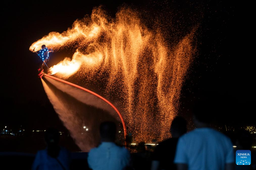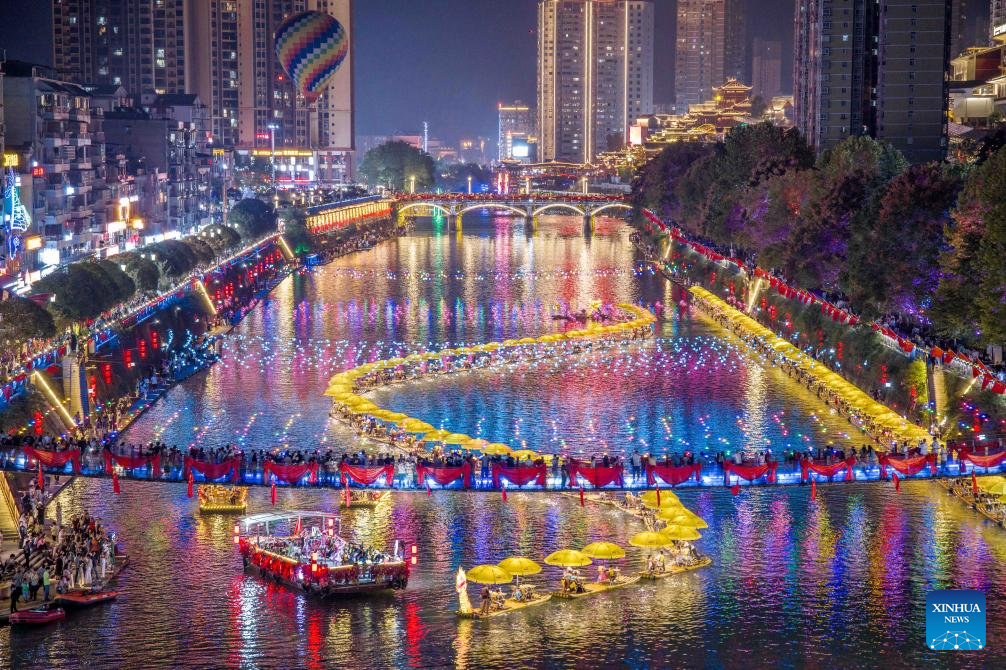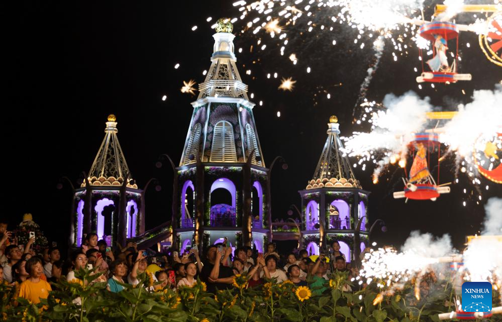 People watch a show at a park in Shanghai, east China, Oct. 7, 2025. Tourists across the country show no sign of fading enthusiasm as the National Day and Mid-Autumn Festival holiday draws to a close. (Xinhua/Wang Xiang)