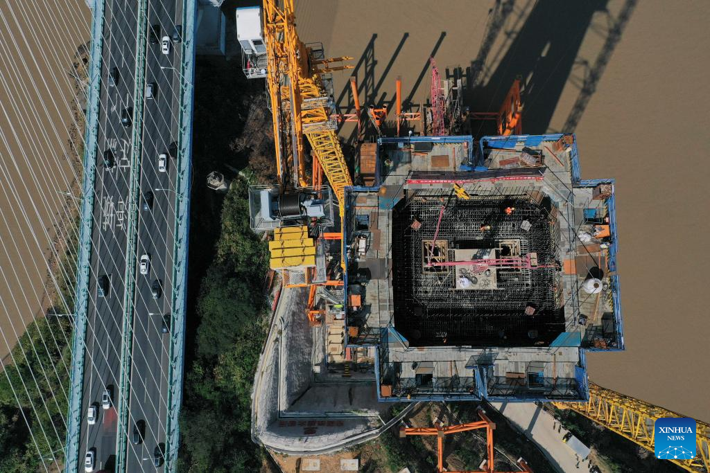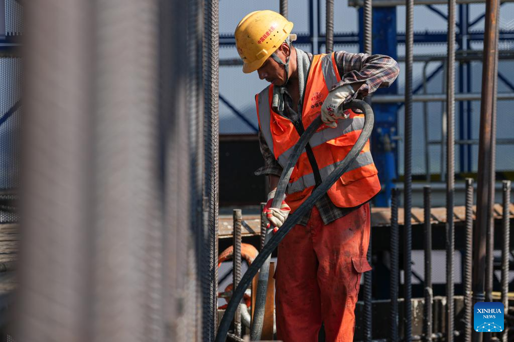 A constructor works at the construction site of the Taoyaomen highway-railway bridge in Zhoushan, east China's Zhejiang Province, Oct. 6, 2025. A main tower of the Taoyaomen highway-railway bridge, constructed by the China Railway Major Bridge Engineering Group Co., Ltd., was successfully closed on Monday, marking a significant breakthrough of this project.