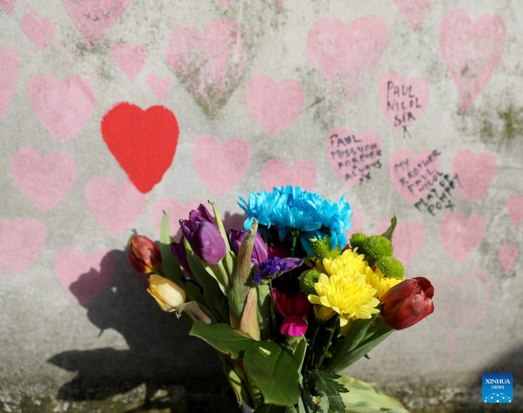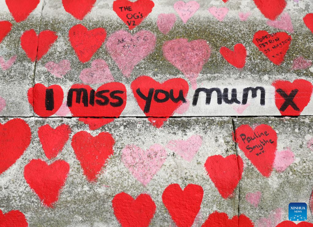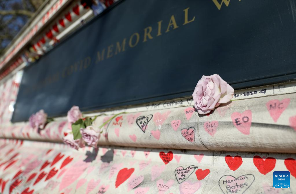 Flowers, hand painted hearts and messages commemorating victims of the COVID-19 pandemic are seen on the National COVID Memorial Wall in London, Britain, March 27, 2022. (Xinhua/Li Ying)