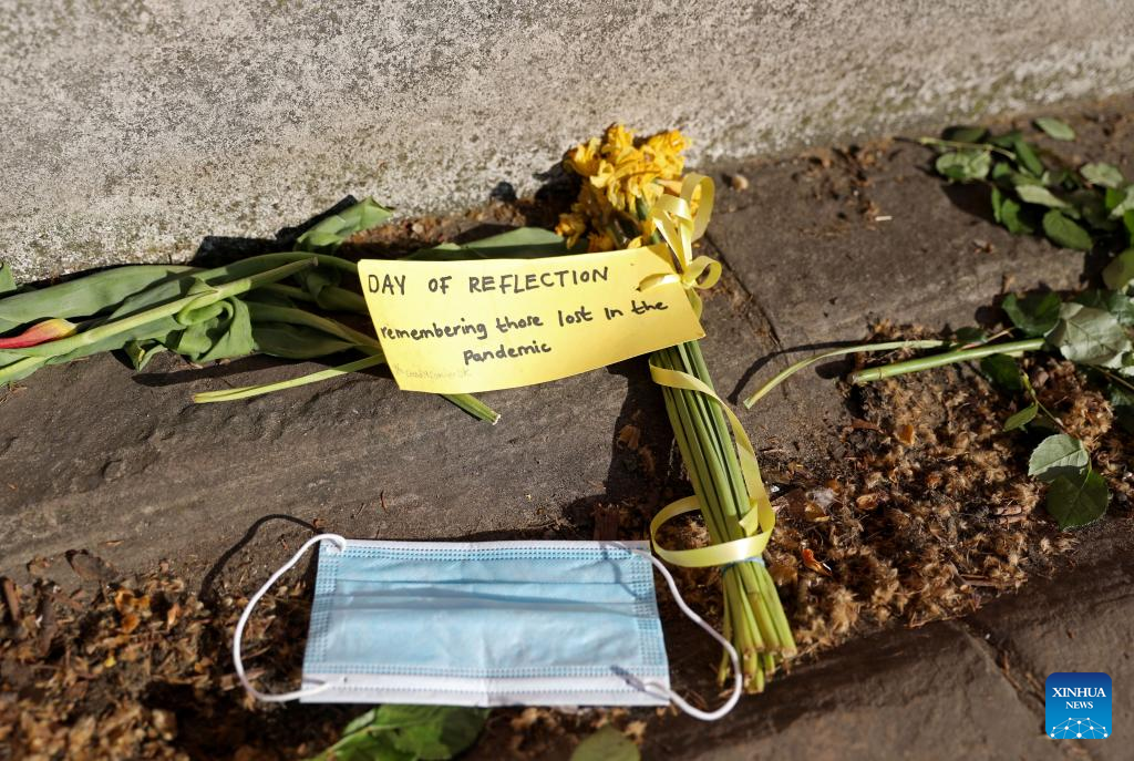 A bunch of flowers are laid as a tribute to victims of the COVID-19 pandemic at the National COVID Memorial Wall in London, Britain, March 27, 2022. (Xinhua/Li Ying)