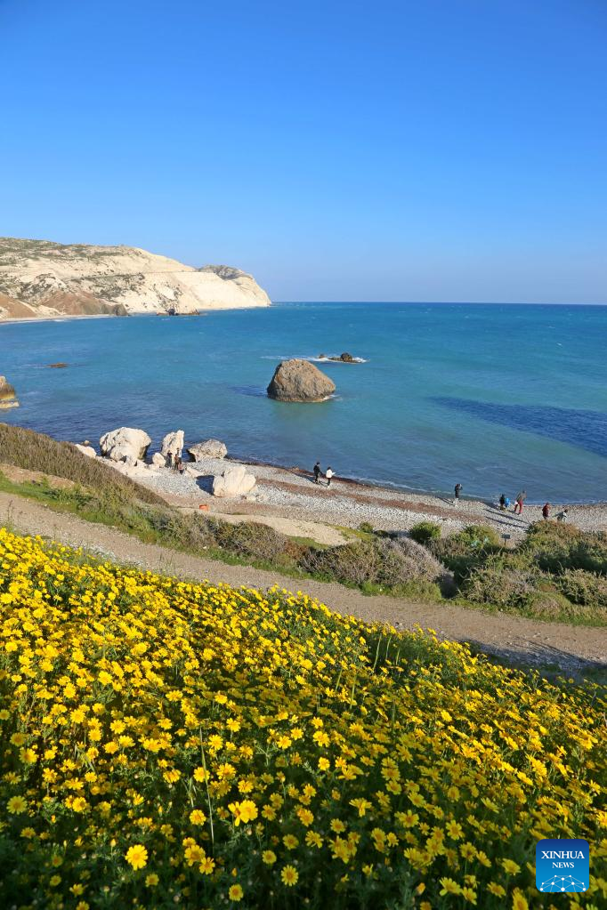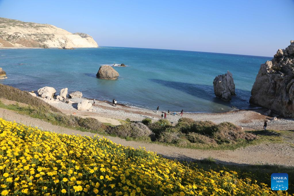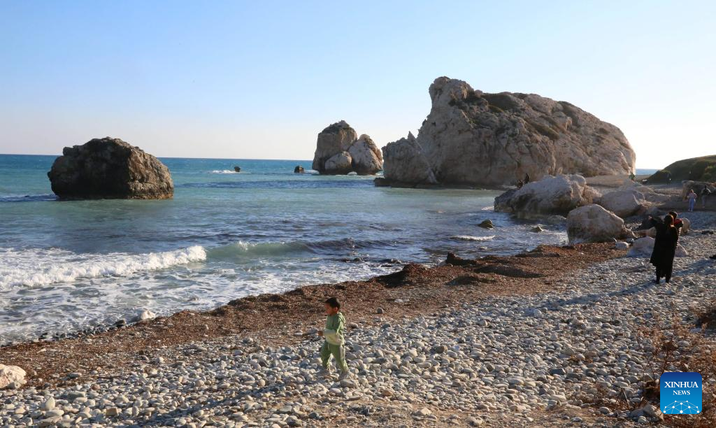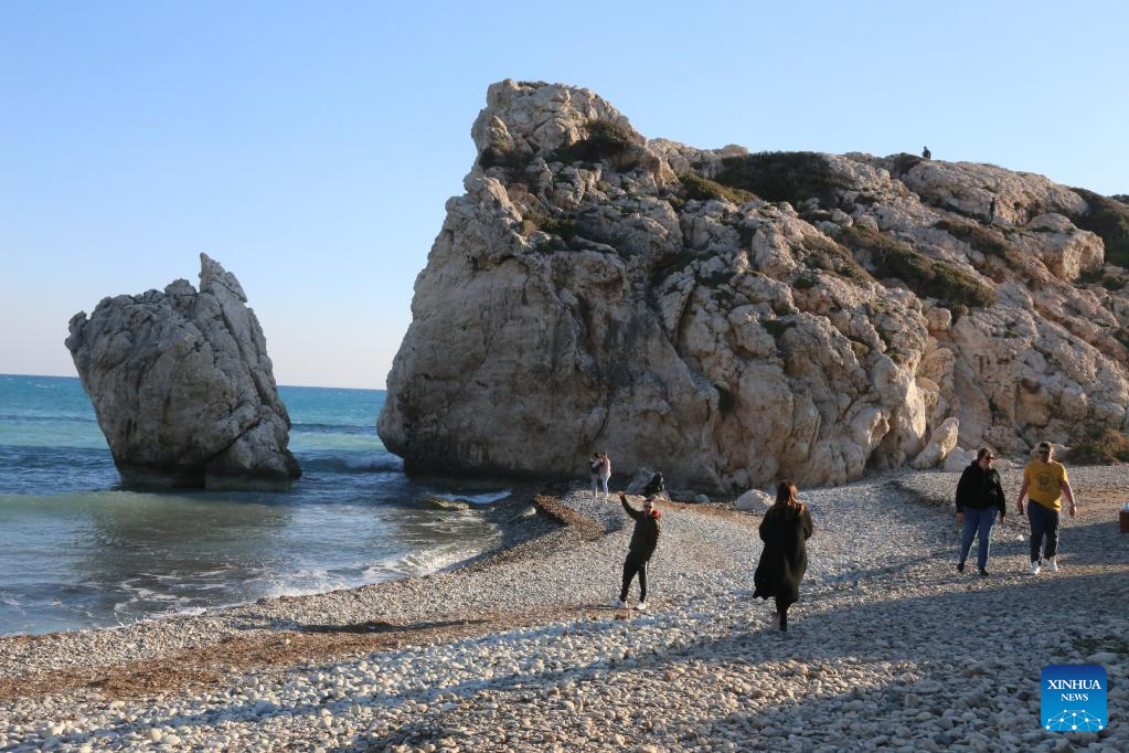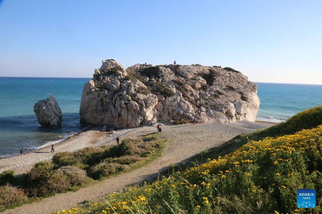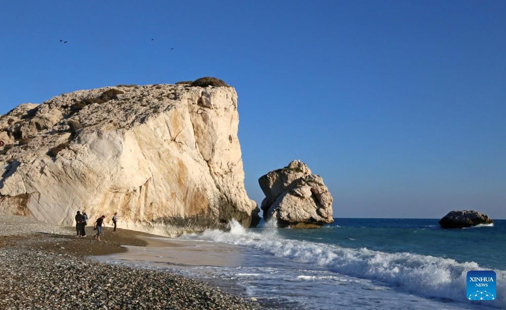 People visit the Petra tou Romiou, also known as Aphrodite's Rock, in Paphos, Cyprus, March 27, 2022. (Xinhua/Guo Mingfang)