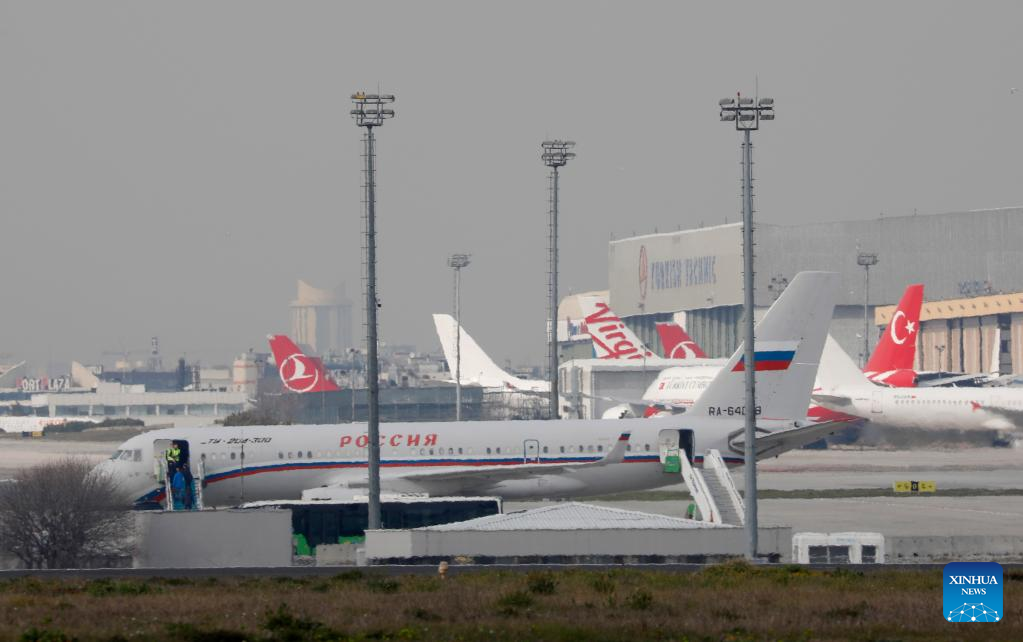 Photo taken on March 28, 2022 shows the plane carrying the Russian delegation at the Ataturk Airport in Istanbul, Turkey. The Russian and Ukrainian delegations have arrived in Turkey's largest city Istanbul on Monday for a fresh round of face-to-face peace talks, aiming to achieve substantial progress to end the crisis. (Xinhua)