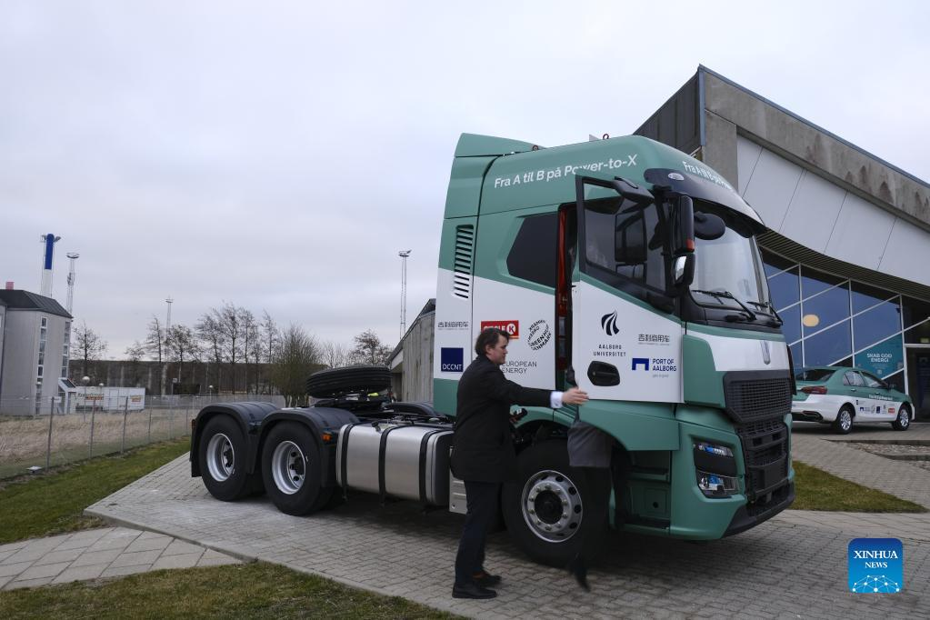 A heavy truck fueled with e-methanol is seen in Aalborg, Denmark on March 28, 2022. Chinese company Geely began test runs of green e-methanol vehicles in the Danish port of Aalborg on Monday. (Xinhua/Lin Jing)