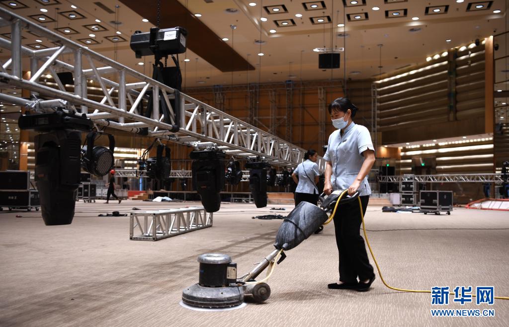 4月10日,工作人員在對(duì)主會(huì)場(chǎng)進(jìn)行清潔作業(yè)。