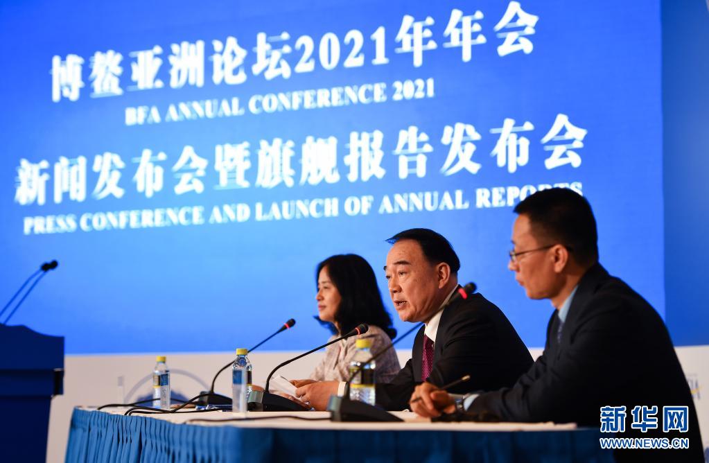 4月18日,博鰲亞洲論壇秘書長李保東(右二)在新聞發(fā)布會上講話。